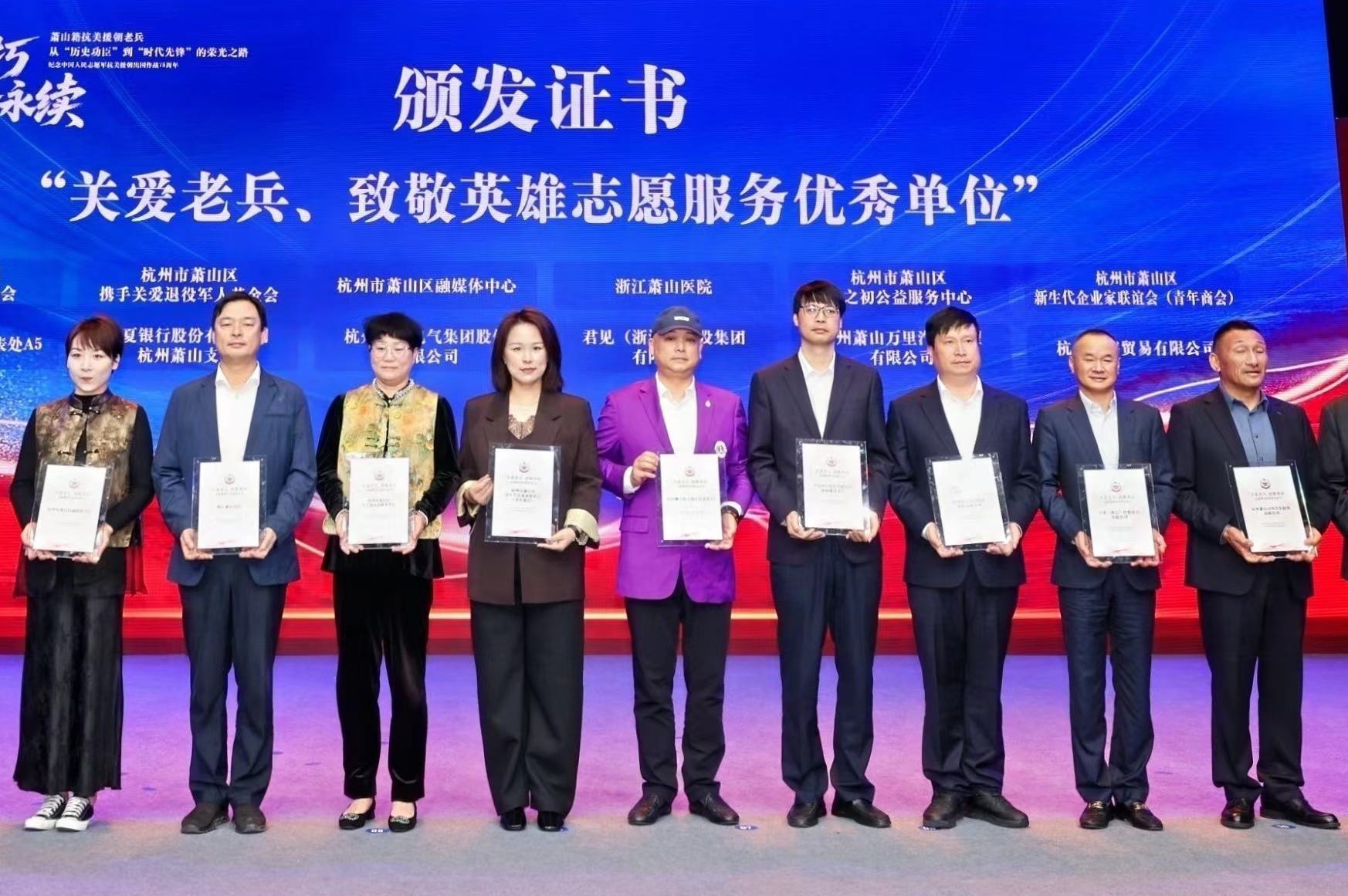 10  24 日,萧山区举办萧山籍抗美援朝老兵从‘历史功臣’到‘时代先锋’的荣光之路——纪念中国人民志愿军抗美援朝出国作战75周年”活动。由于公司在关爱老兵志愿服务领域的突出表现,荣获萧山区关爱老兵致敬英雄志愿服务先进单位”证书,公司党委副书记、人武部长曹锟出席活动并上台领奖。